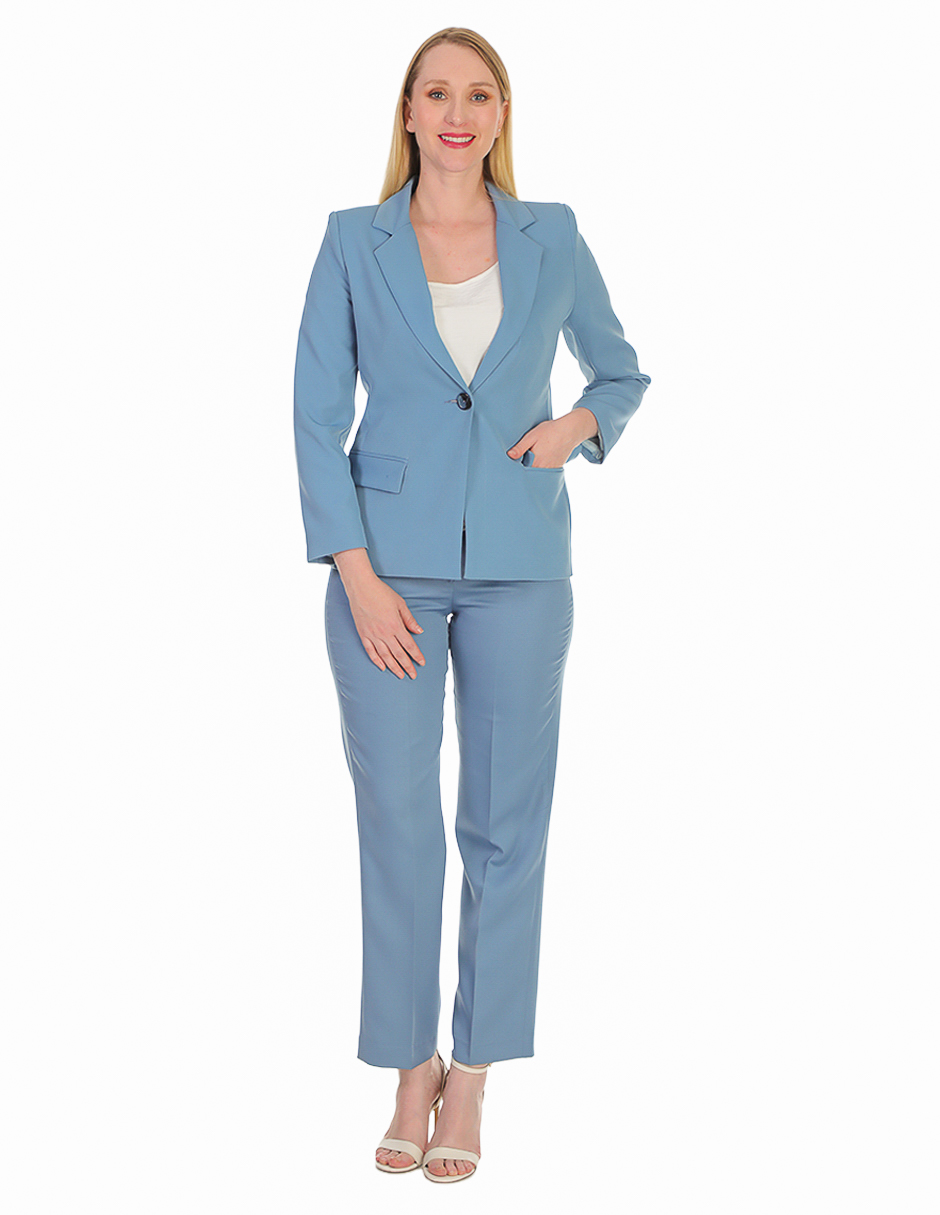 Traje ejecutivo azul celeste completo de blazer clásico y pantalón a juego. El blazer presenta un botón frontal, solapas tradicionales y construcción estructurada que favorece la silueta. Color azul celeste que transmite confianza y serenidad profesional. El pantalón de corte recto y talle alto complementa perfectamente el conjunto. Ideal para ejecutivas que buscan proyectar autoridad con un toque de frescura y modernidad. Perfecto para reuniones de primavera/verano, presentaciones y eventos corporativos donde se requiere elegancia con diferenciación.