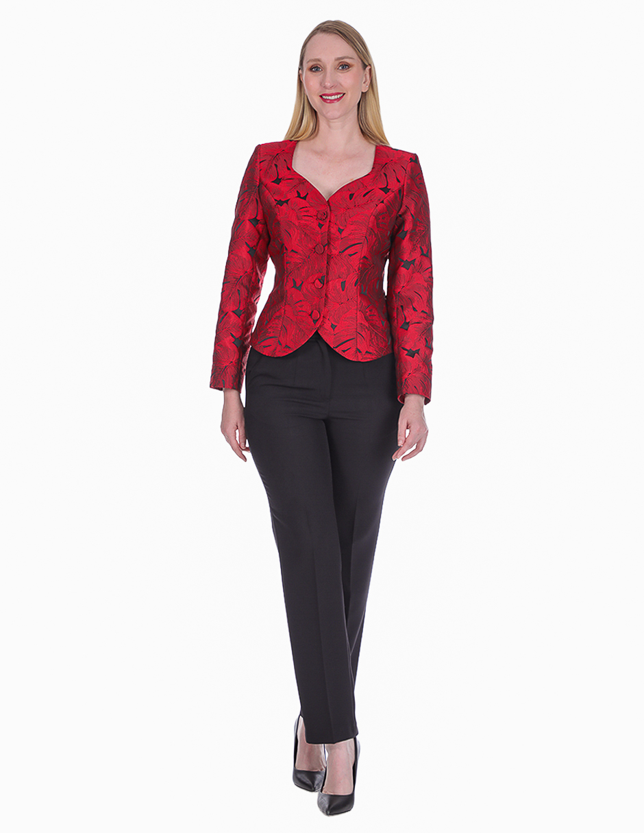 Blazer ejecutivo rojo con estampado floral negro de botones frontales, combinado con pantalón negro de vestir. El blazer presenta un diseño sofisticado con patrón floral que añade interés visual mientras mantiene la elegancia profesional. Cuello en V favorecedor y corte entallado que define la silueta. El contraste con el pantalón negro crea un look ejecutivo impactante. Ideal para reuniones importantes, presentaciones y eventos donde se requiere proyectar autoridad con estilo distintivo.