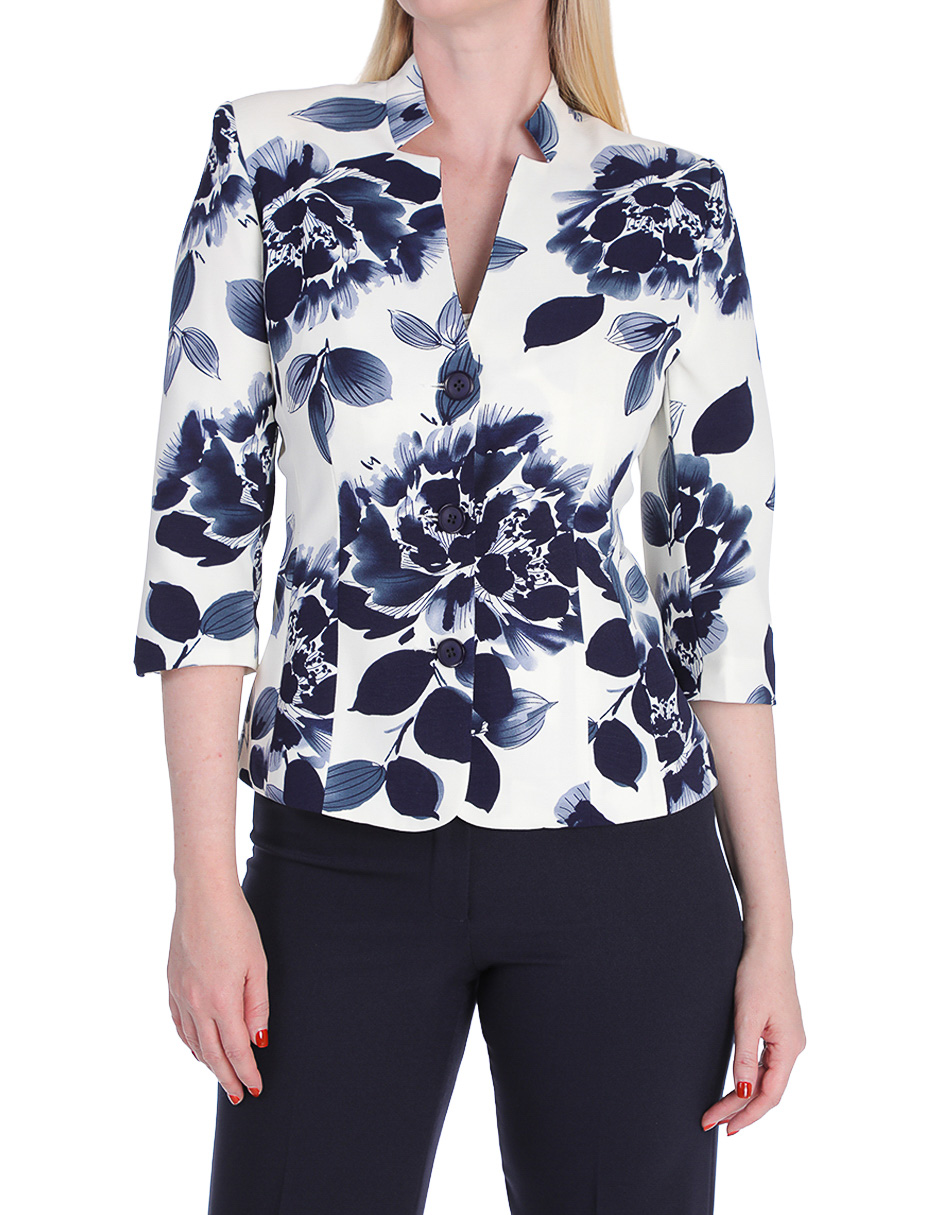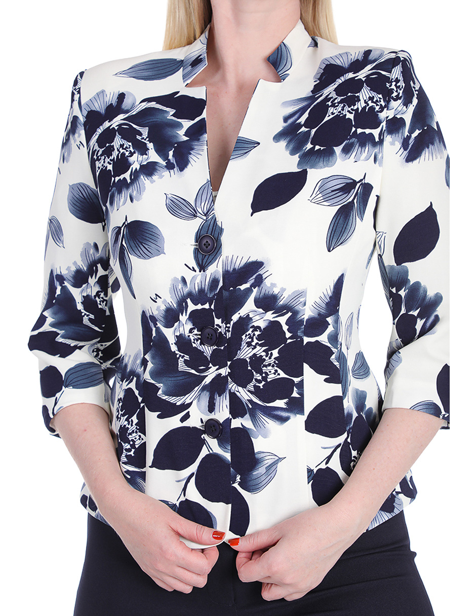 Blusa blanca con estampado floral en tonos azul marino: la base perfecta para lucir profesional sin renunciar a la feminidad