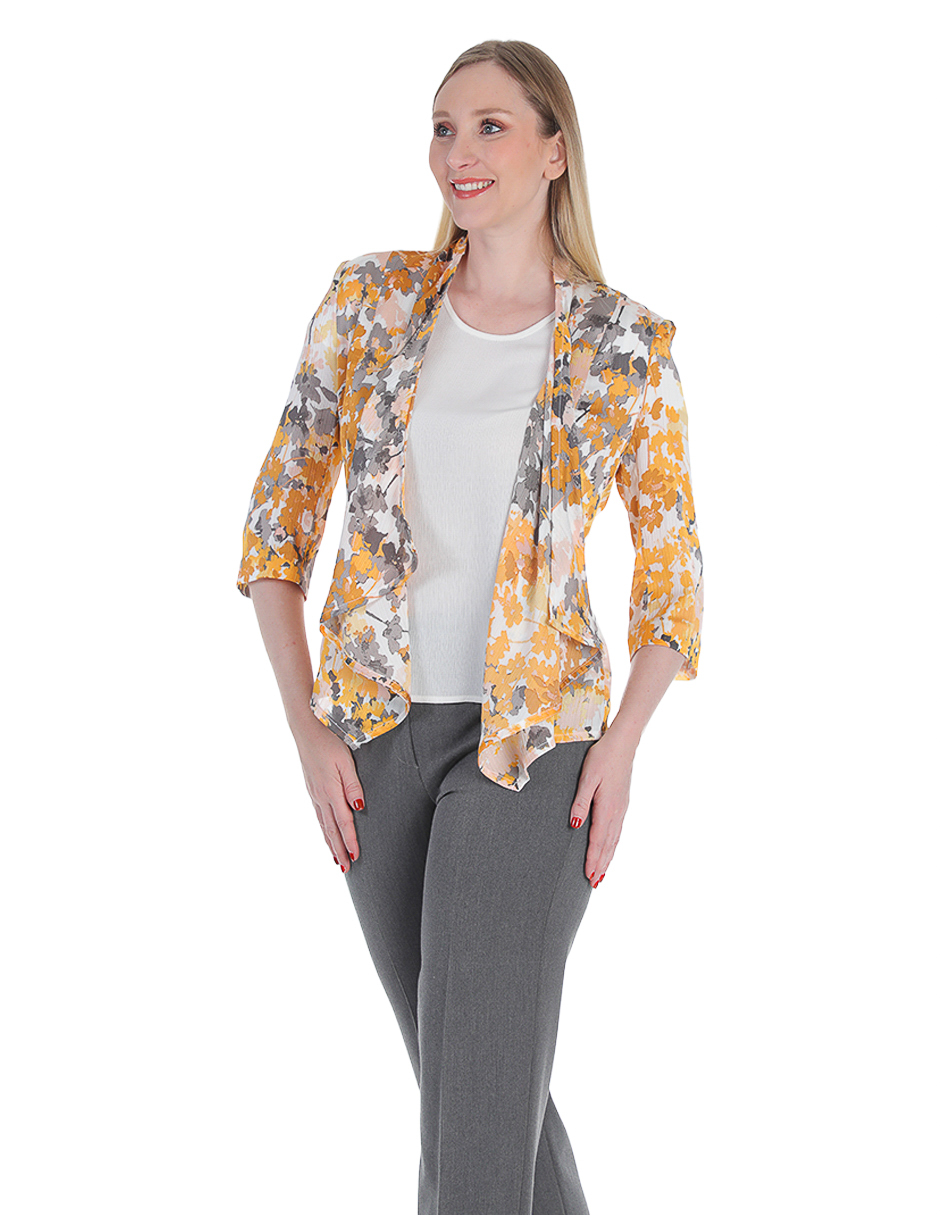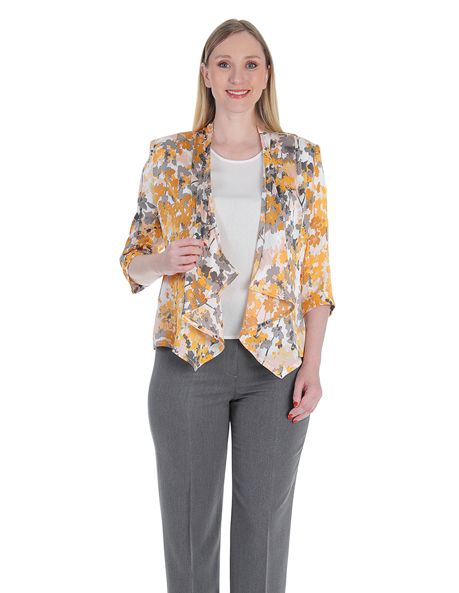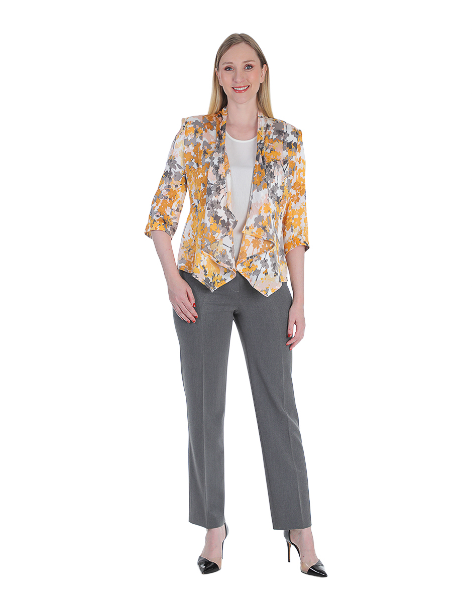 Blazer con estampado en naranja/gris con manga 3/4 y pantalón gris: energía elegante para oficina y juntas.