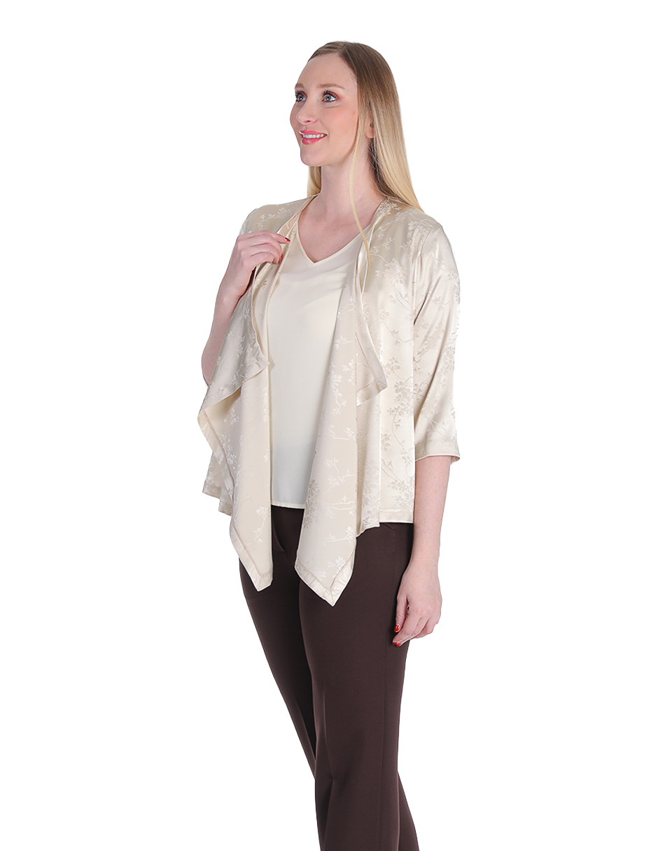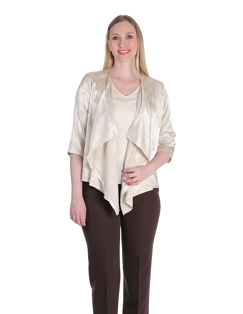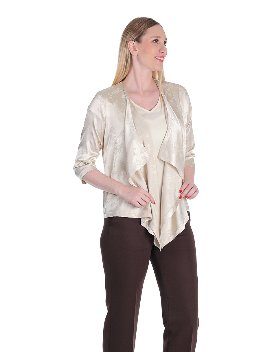 Cardigan en tono champagne con acabado satinado y caída asimétrica, con pantalón chocolate.