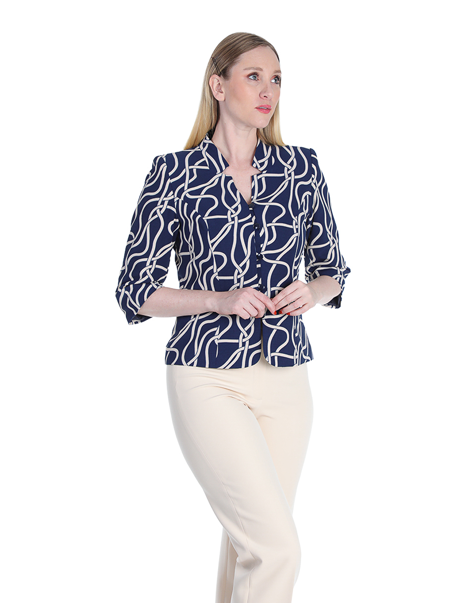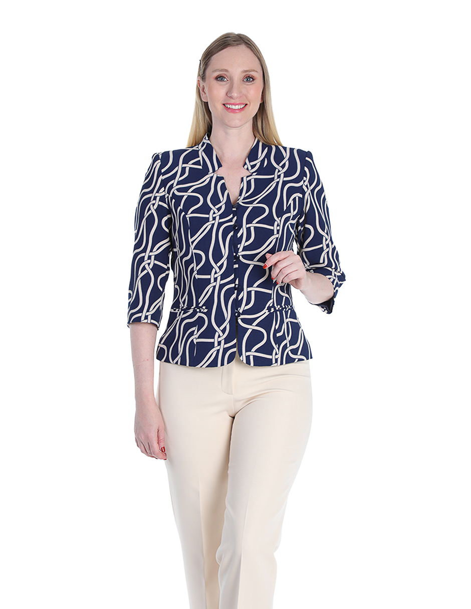 Blazer azul marino con estampado geométrico beige y pantalón marfil.