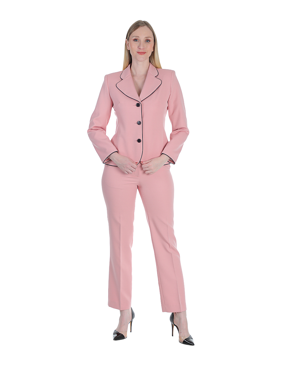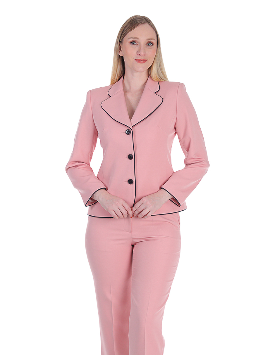 Traje sastre rosa con detalles negros: femenino, ejecutivo y perfecto para destacar con elegancia en oficina.